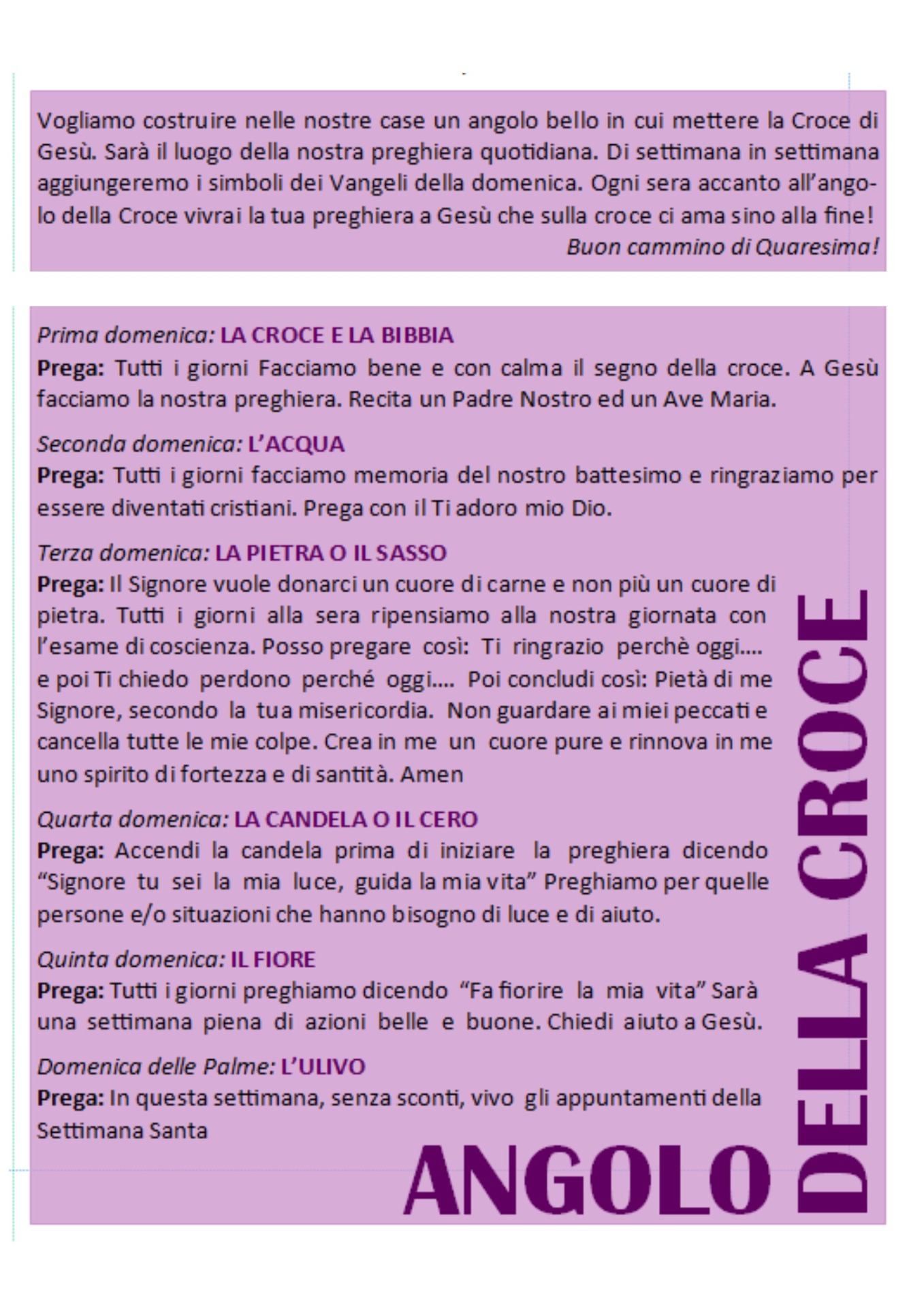 Vogliamo costruire nelle nostre case un angolo bello in cui mettere la Croce di Gesù. Sarà il luogo della nostra preghiera quotidiana. Di settimana in settimana aggiungeremo i simboli dei Vangeli della Domenica. Ogni sera, accanto all'angolo della croce, vivrai la tua preghiera a Gesù che sulla croce ci ama sino alla fine! Buon cammino di Quaresima!